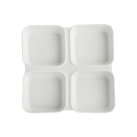 Elegant 8.5" White Ceramic Dessert Plate with 4 Compartments Crafted from high-quality porcelain, this 8.5-inch square plate features four evenly sized compartments ideal for serving desserts, snacks, appetizers, or tasting menus. The minimalist design brings a modern touch to your table while keeping food beautifully separated. Perfect for cafes, restaurants, and home entertaining.