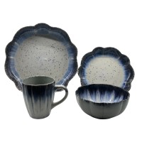 This 16-piece ceramic stoneware dinnerware set features a unique reactive glaze finish with natural blue tones and subtle speckled details. Each piece is crafted from durable stoneware and fired at high temperature, offering excellent strength, chip resistance, and everyday practicality. The softly scalloped rims and hand-finished reactive glaze create a natural, artisanal look, making this set suitable for both modern home dining and hospitality use such as restaurants, cafés, and boutique hotels. The set includes dinner plates, side plates, bowls, and mugs, providing a complete tableware solution for daily meals and special occasions.